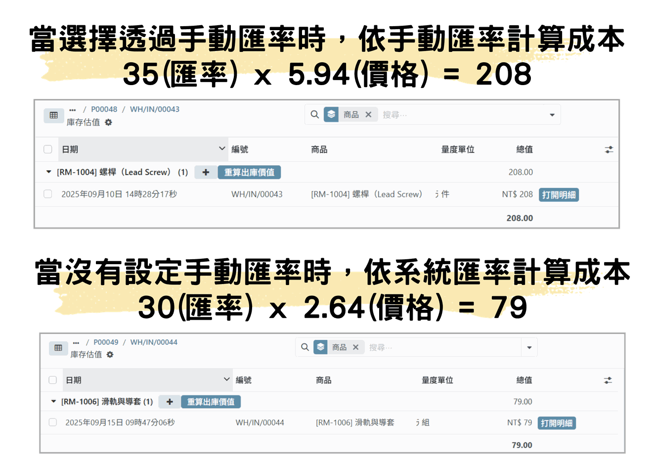 - 庫存價值:採購成本可依手動或自動匯率計算,避免存貨價值偏差。